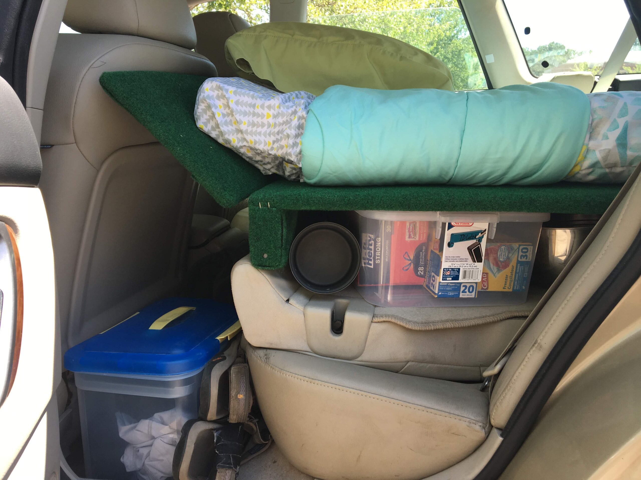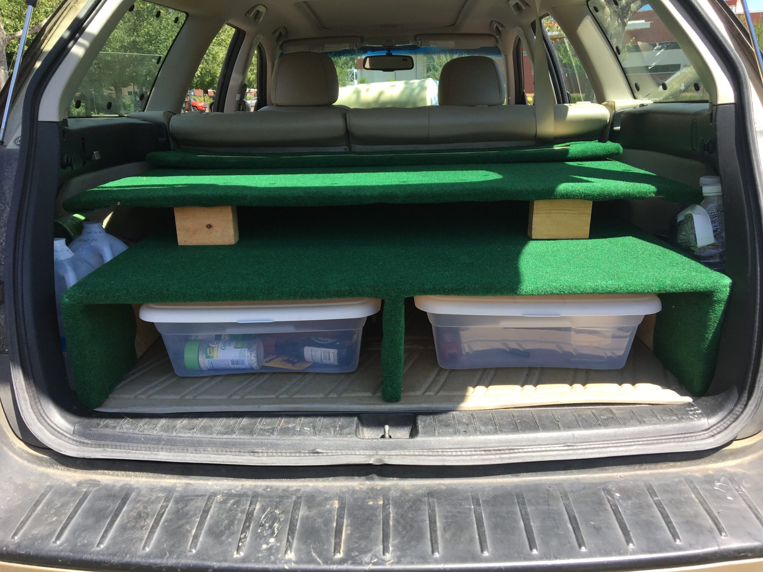 The design is unique for several reasons. it provides ample storage centered around two long, sliding containers without sacrificing strength. It is also precisely carpeted to ensure user comfort and surface protection. The most important feature, however, is its modular, stacking design that allows the back seats of the vehicle to be set in upright position when the bed platform is not necessary. The transition between stowed and deployed platform takes less than one minute, and the stacked upper half provides shelved storage in the hatch. Therefore, with the system still in the car, I do not have to sacrifice storage or passenger capacity.